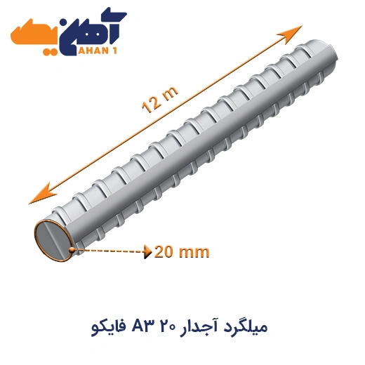 میلگرد آجدار ۲۰ A3 شاخه ۱۲ متری فایکو